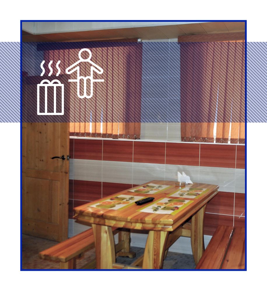 Прихожая, семейный зал на 2 человека, финская парная, кухня, телевизор, диван, стол, свет с плавным регулированием, душ.